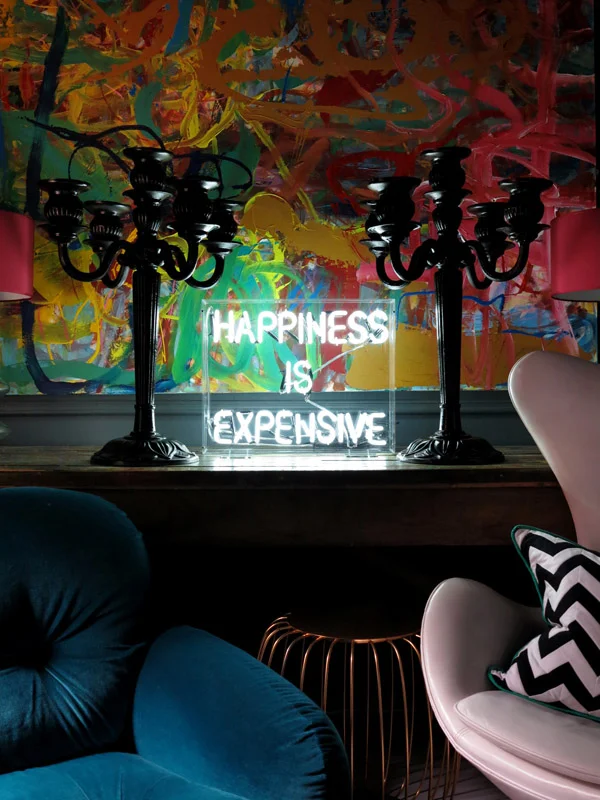 (Above: ‘Happiness is expensive’ neon.)