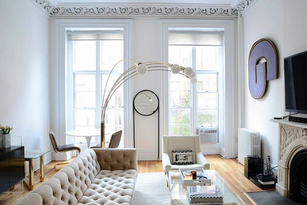 With its floral crown ceiling moulding, decorative marble fireplace and full height windows this West Village New York apartment offers up a canvas any interior designer would be happy to work with.
