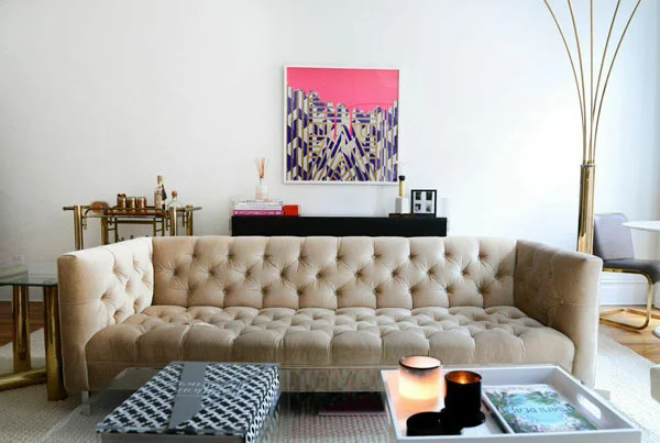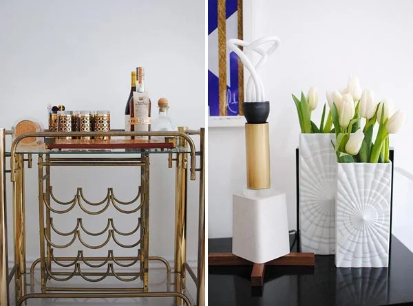 Just one look at the brass bar cart is enough to make me want to reach for a cocktail and sink into the comfort of that gorgeous button back sofa.