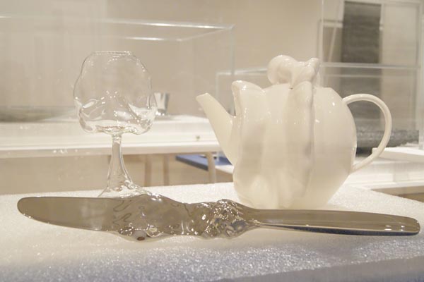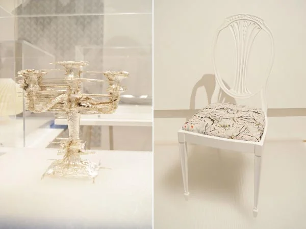 The exhibition showcases some of the ways in which digital technologies are providing liberating opportunities and outcomes for craft practitioners. It includes jewellery and silverware created using rapid prototyping, which allows the designer to digitally sculpt forms that it would otherwise be impossible to create, as well as examples of digital printing such as this chair upholstered in ‘White Moth All Over’ by Timorous Beasties.