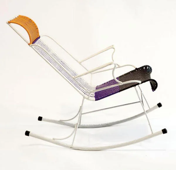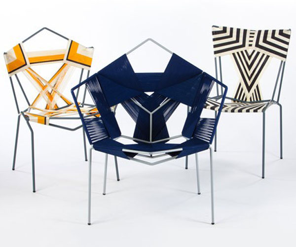 Rami Tareef has created this series of geometric patterned chairs by applying skills he learned from a wicker craftsman in the Old City of Jerusalem to spare steel frames, wrapping and weaving coloured cords of polypropolene to create strikingly graphic contemporary forms.
